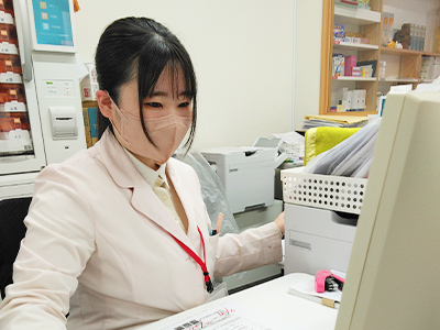 - 調剤事務と聞いて皆様が想像される、処方箋を確認しながら入力、ピッキング等を行う事務業務をメインに、また、請求業務を任されております。