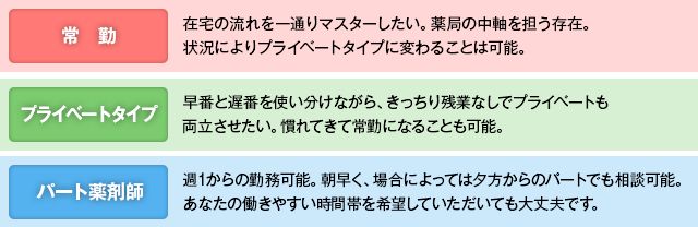 | 必要資格 | 薬剤師免許(取得見込みの方)・普通自動車免許(AT可) |
